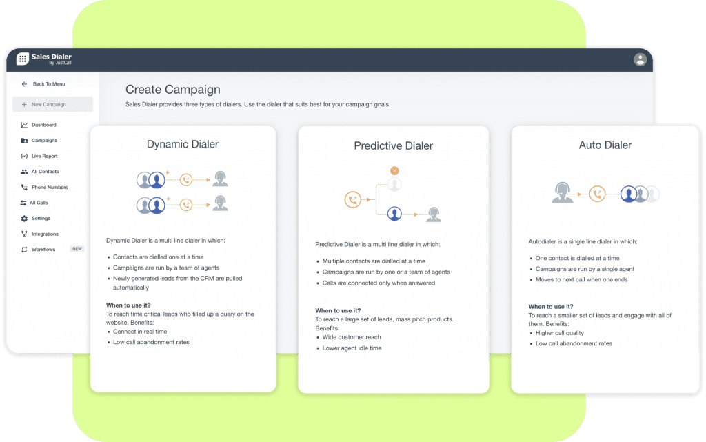 Create a campaign by uploading a list of contacts and start dialing the numbers automatically. Drop voicemails whenever a call goes unanswered. Choose from three kinds of dialers, AutoDialer, Predictive Dialer, and Dynamic Dialer.